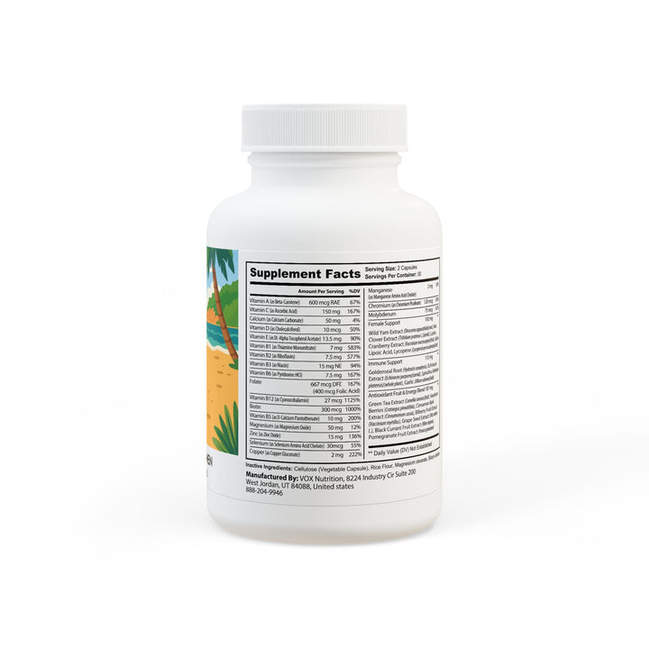 Each capsule combines essential vitamins and minerals — A, C, D, E, B-complex, Calcium, Magnesium, Zinc, Selenium, and more with a premium blend of botanical extracts, including Wild Yam, Red Clover, Lutein, Cranberry, Spirulina, Garlic, Hawthorn Berry, Cinnamon Bark, Grape Seed, Black Currant, and Pomegranate. Together, they nourish your hair, skin, immune system, and metabolism.